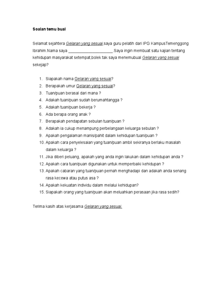 Contoh Soalan Temu Bual Masyarakat Setempat